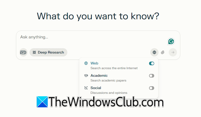 yra geriausias paieškos variklio įrankis šiame sąraše. Aš jį panaudojau ir radau geriausią iš visų šiame straipsnyje išvardytų įrankių. „Perplexity“ turi tris parinktis ieškoti jūsų užklausos internete: