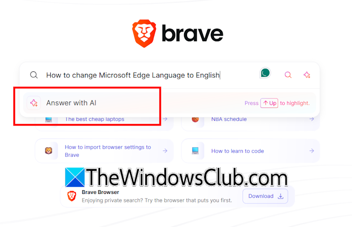 „Brave“ yra dar viena populiari privati naršyklė, turinti puikių funkcijų. Jį taip pat maitina AI, kad atsakytų į vartotojų užklausas. Norėdami naudoti Brave AI Brave Search, apsilankykite Brave paieškos variklyje ir įveskite užklausą paieškos laukelyje. Po to pasirinkiteAtsakykite naudodami AIvariantas.