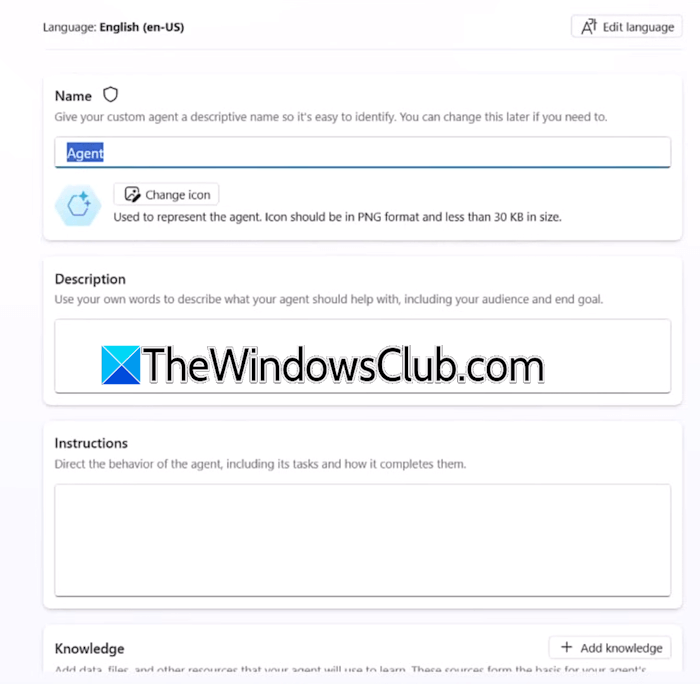 Pavadinkite agentą, pateikite aprašymą, pridėkite keletą instrukcijų ir pridėkite žinių bazę. Kai baigsite, spustelėkiteSukurtimygtuką, kad sukurtumėte agentą. Sukurti žinių bazę naudojant Copilot Studio Agent Builder yra lengviau nei naudojant Vertex Agent Builder platformą. Norėdami sukurti žinių bazę, spustelėkitePridėti žiniųmygtuką ir įkelkite failą. Tada galite sukonfigūruoti veiksmus, aktyviklius ir temas, kad jūsų AI agentas veiktų nepriekaištingai.