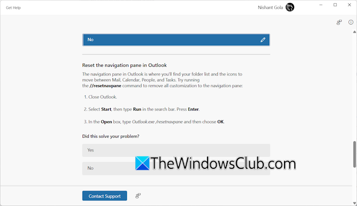 Programėlė „Get Help“ parodys pasiūlymą, kurį turite pabandyti patikrinti, ar jis veikė. Mano atveju, ji pasiūlė rankiniu būdu patikrinti, ar nėra „Office“ naujinimų, ir juos įdiegti (jei yra). Jei pasiūlymas išsprendžia problemą, pasirinkite Taip, kitu atveju pasirinkite Ne. Kai pasirinksite Ne, bus pasiūlytas kitas sprendimas.