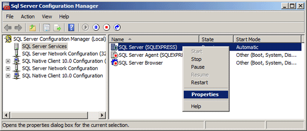 Voer SQL Server Configuratiebeheer uit. KiezenSQL Server-servicesin het linkerpaneel en klik vervolgens met de rechtermuisknop op de gewenste SQL Server-service die in de modus voor één gebruiker moet worden uitgevoerd. SelecteerEigenschappenuit het vervolgkeuzemenu.