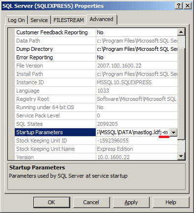 Als u SQL Server 2008, 2005 of een eerdere versie hebt geïnstalleerd, klikt u opGeavanceerdtabblad. Voeg de;-Mtot het einde van deOpstartparametersdoos.