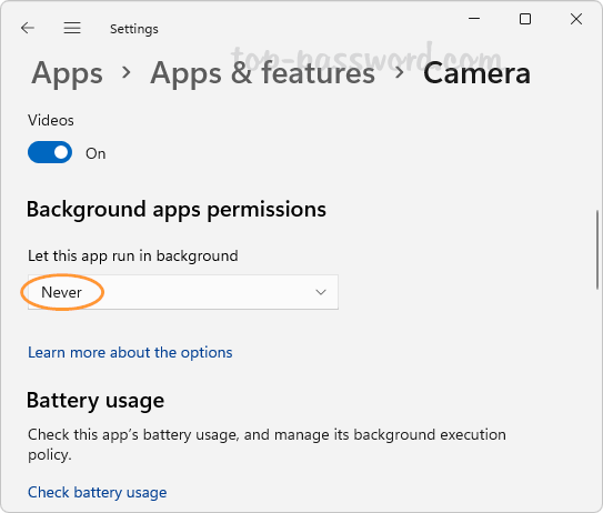 - Onder de “Machtigingen voor achtergrondapps' sectie, selecteer 'Nooit" uit de vervolgkeuzelijst. Deze app wordt nooit op de achtergrond uitgevoerd.