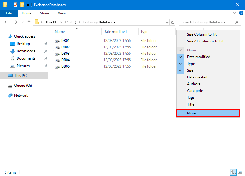 Ga naar deC: Exchange-databasesmap. Klik met de rechtermuisknop op de kolom en selecteerMeer.