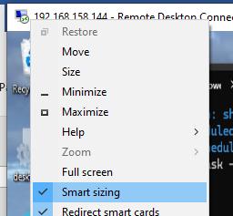 In moderne versies van de RDP-client kunt u dit inschakelenSlimme maatvoeringonderweg door de overeenkomstige optie te selecteren in het menu in de linkerbovenhoek van de RDP-client.