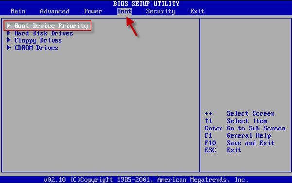 Stap 3: Op deBIOS-setuphulpprogramma, markeer het tabblad Opstarten met behulp van→En←sleutels. Druk op↑of↓toetsen om te selecterenPrioriteit van opstartapparaaten raakBinnenkomen.