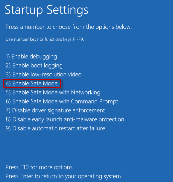 Nadat uw apparaat opnieuw is opgestart, selecteert u de optie4uit de lijst of druk opF4voor Veilige modus.