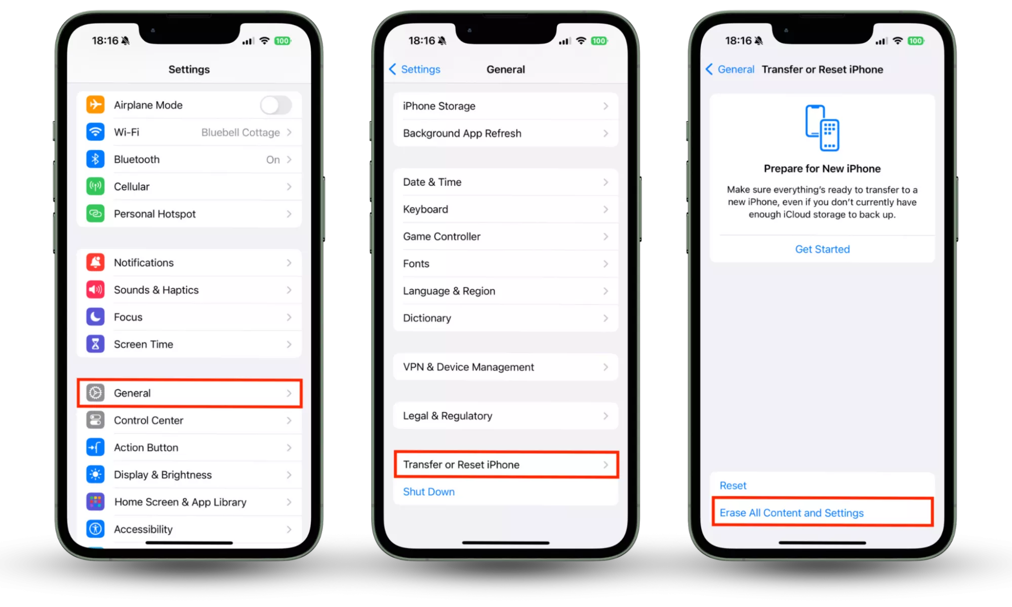 Tik in Instellingen op Algemeen > iPhone overbrengen of opnieuw instellen > Wis alle inhoud en instellingen.4. Voer een fabrieksreset uit