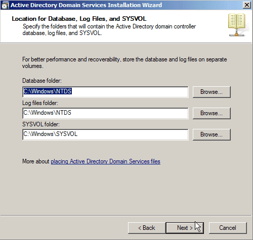 18.Vervolgens kunt u ervoor kiezen om de bestanden te plaatsen die nodig zijn voor Active Directory, inclusief deDatabase, logbestanden en SYSVOL.