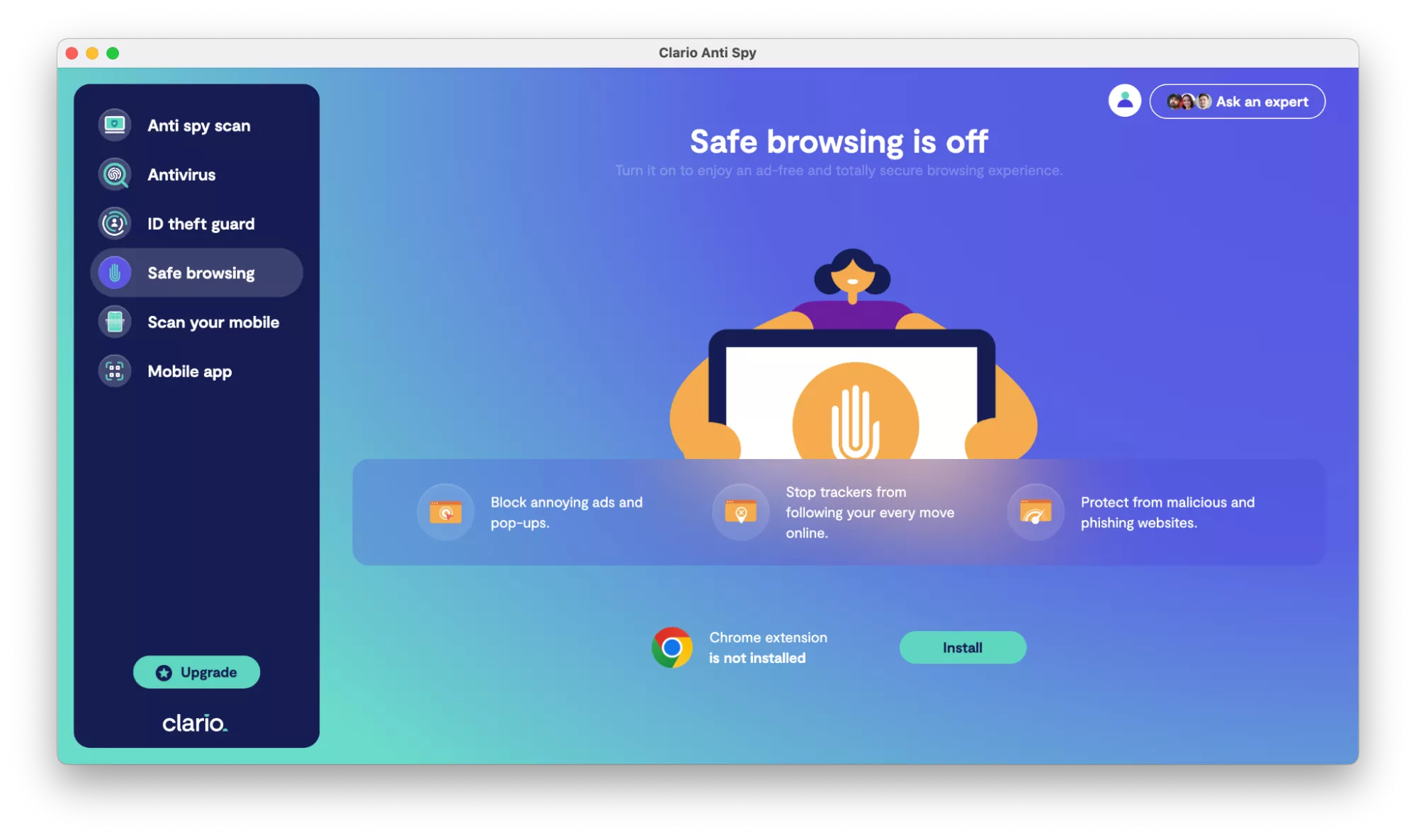 U kunt uzelf beschermen tegen gevaarlijke websites met de krachtige Safe Browsing-functie van Clario AntiSpy. Safe Browsing voorkomt dat schadelijke websites trackers gebruiken om al uw bewegingen te volgen en uw online activiteiten te controleren. Volg deze stappen om aan de slag te gaan: