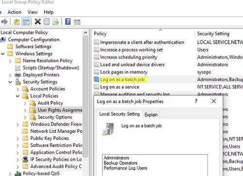 - Als de taak wordt uitgevoerd als een gebruiker zonder rechten, moet zijn of haar account worden toegevoegd aan het lokale beveiligingsbeleidAanmelden als batchtaak (gpedit.msc-> Computerconfiguratie->Windows-instellingen->Beveiligingsinstellingen->Lokaal beleid->Toewijzing van gebruikersrechten).Er verschijnt een waarschuwing bij het maken van een dergelijke taak: