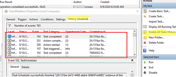 Als het PowerShell-script met succes is uitgevoerd, wordt er een bericht weergegeven in het Laatste Run-resultaat:The operation completed sucessfully (0x0).