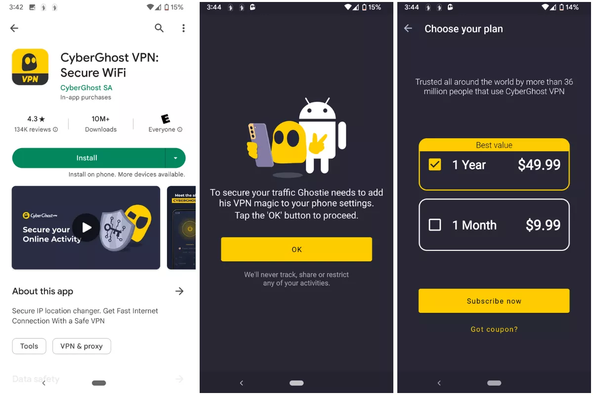 U kunt een gratis proefperiode van drie dagen krijgen voor CyberGhost VPN op Android wanneer u de app downloadt van hun website.