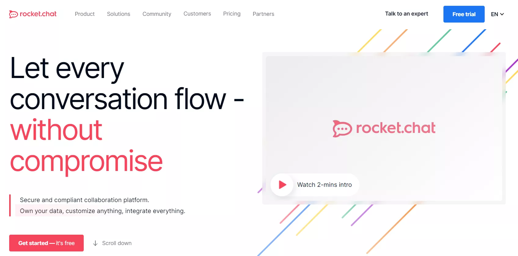 Rocket.Chat profileert zich als de veiligste samenwerkingstool voor ondernemingen. Het is een geweldige oplossing voor organisaties die hun eigen chatoplossing op locatie willen hosten. Het biedt ook een basis voor ontwikkelaars om hun eigen chatplatforms te laten groeien.