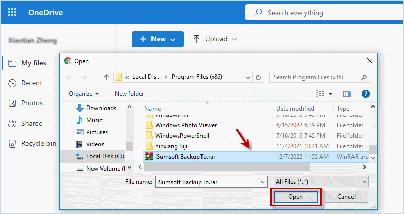 Stap 3: Wanneer een pop-upvenster verschijnt, kiest u uw programmabestand en klikt u opOpen.Vervolgens uploadt OneDrive uw bestanden naar de cloud.