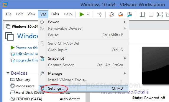 - Open VMware Workstation en ga naar een bestaande virtuele machine. Klik op deVMmenu en selecteerInstellingen.