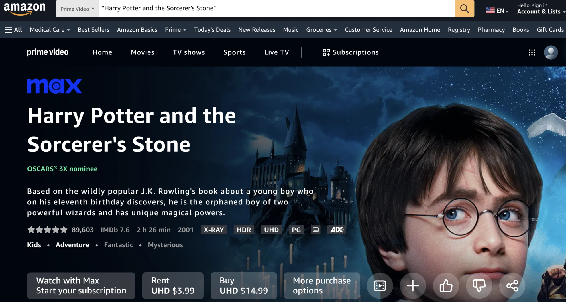 Vanwege licentieovereenkomsten neemt Amazon Prime de Harry Potter-serie niet op in zijn abonnement. U kunt de films echter afzonderlijk huren of kopen.