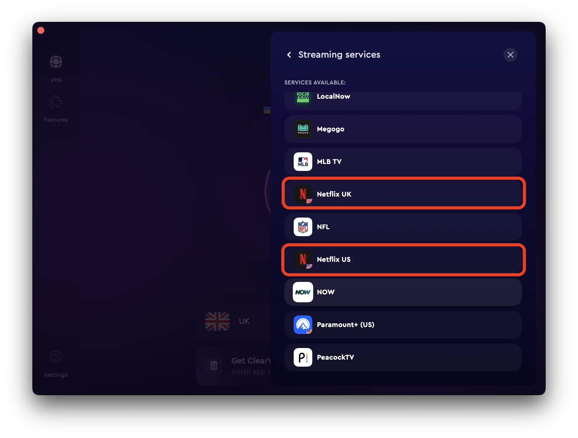 Het enige wat u hoeft te doen, wijzigt gewoon uw locaties via ClearVPN naar VK of AU, of kiest Netflix UK op het tabblad streamingdiensten.