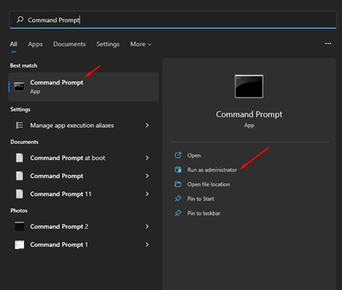 1. Open Windows Search en typ de opdrachtprompt. Klik met de rechtermuisknop op de CMD en selecteerUitvoeren als beheerder.
