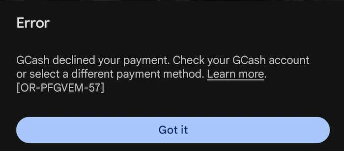 "GCash heeft uw betaling geweigerd. Controleer uw GCash-account of selecteer een andere betaalmethode. Meer informatie. [OR-PFGVEM-57]"