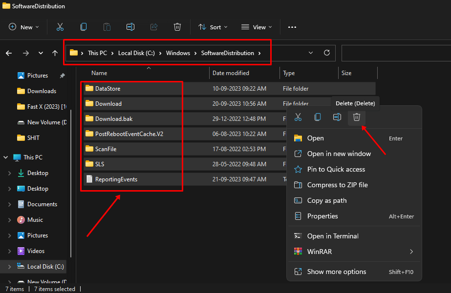 3. Ga daarna naar het padC: WindowsSoftwaredistributieen DrukCtrl+Aen verwijder alle bestanden. Ga op dezelfde manier naar padC:WindowsSystem32Catroot2en verwijder alle bestanden.
