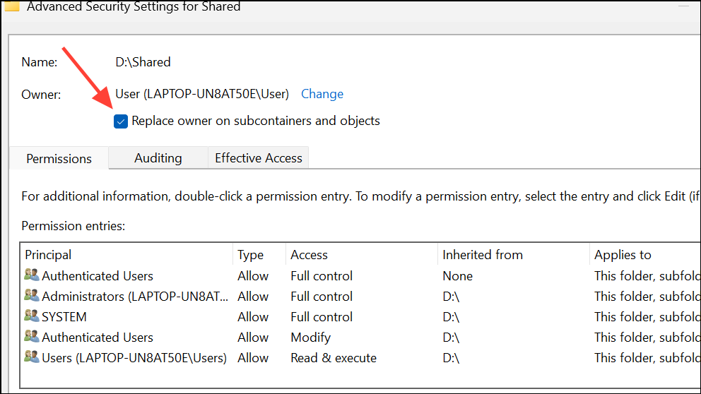 Stap 4:Terug in het venster Geavanceerd vinkt u dit aanReplace owner on subcontainers and objectsals u het eigendom wilt toepassen op alle bestanden en submappen. KlikApplyEnOK. Bij grote mappen kan dit proces enkele minuten duren.