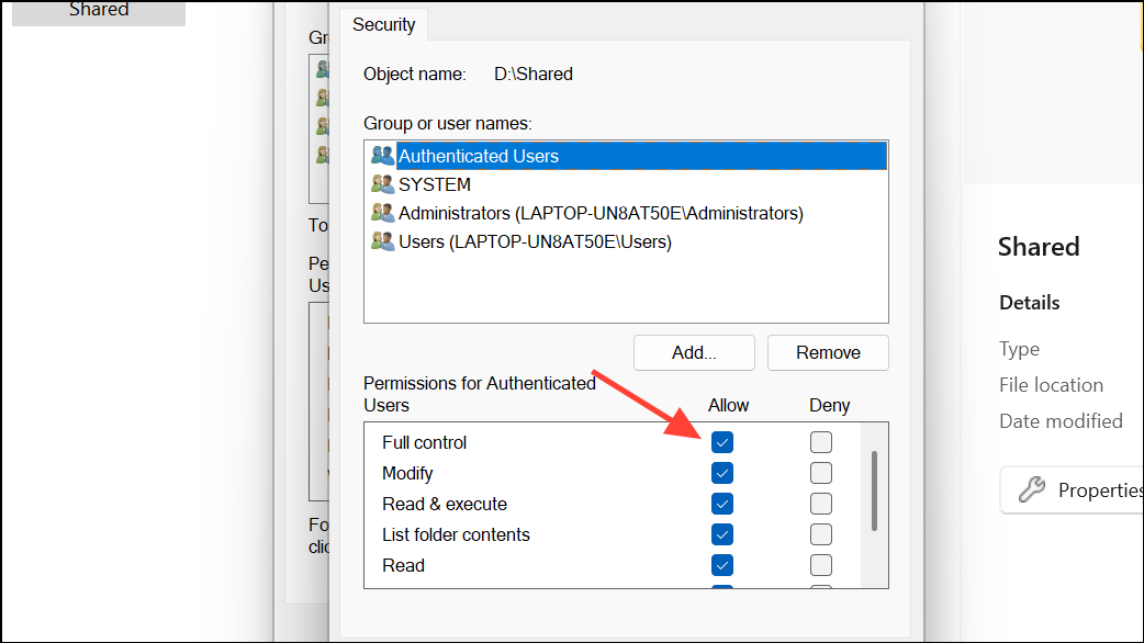 Stap 5:Nadat het eigendom is overgedragen, keert u terug naar het tabblad Beveiliging. KlikEdit, selecteer uw gebruikersaccount en controleer deFull Controlvak onder de kolom Toestaan. KlikApplyEnOKom wijzigingen op te slaan.