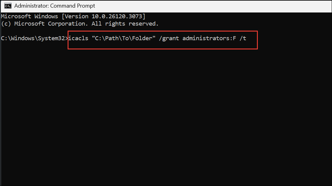 VervangenC:PathToFoldermet het daadwerkelijke mappad. Met deze opdracht wordt uw account eigenaar van de map en de volledige inhoud ervan.