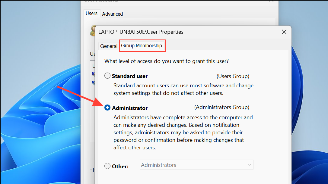 Stap 2:In het venster Gebruikersaccounts selecteert u uw account en klikt u opProperties. Ga naar deGroup Membershiptabblad en selecteerAdministrator. KlikApplyEnOK.