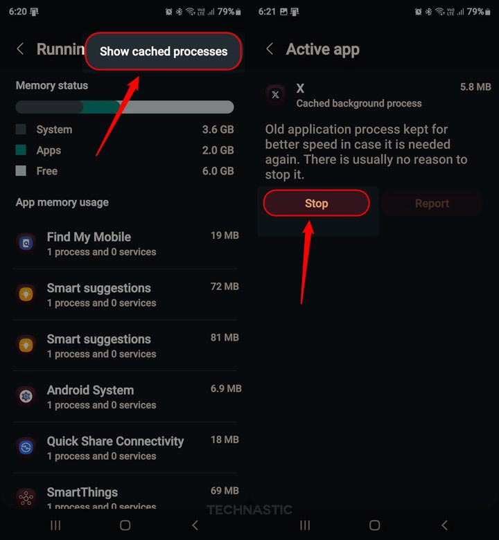 - Om apps en processen in het cachegeheugen te sluiten, tikt u op dePictogram met 3 stippenin de rechterbovenhoek van deLopende dienstenscherm en selecteerGecachte processen weergeven.