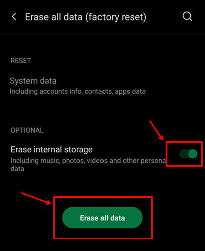 2. Nu ziet u opties om systeemgegevens opnieuw in te stellen, de interne opslag te wissen of beide. Selecteer zowel enTelefoon resetten/alle gegevens wissen > Bevestigen.