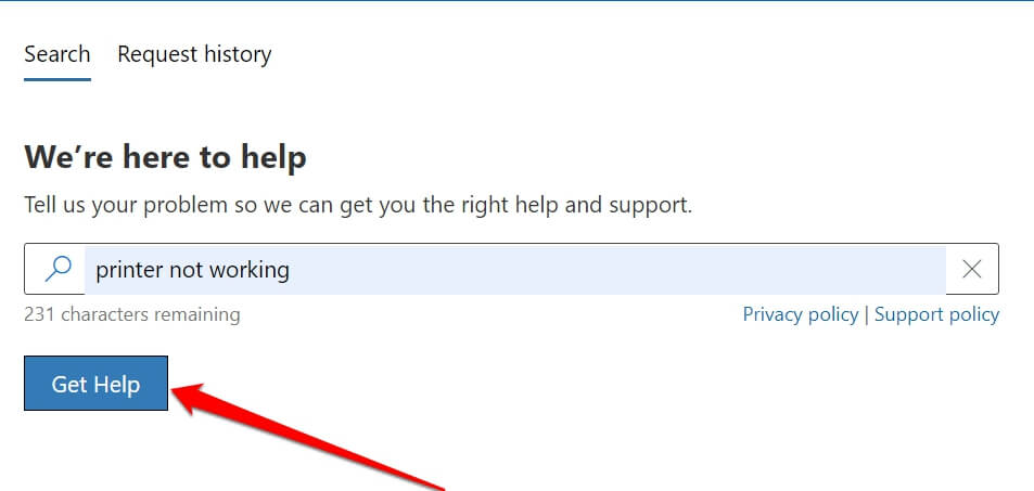 - Beschrijf vervolgens kort het probleem en klik op deKrijg hulpknop.