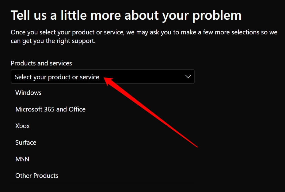 - Op de volgende pagina wordt u gevraagd dit te doenselecteer het product of de dienstwaarvoor u de hulp van de technische ondersteuning van Microsoft wilt inroepen.