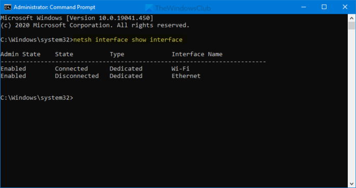 In eerste instantie zal dat nodig zijn. Daarvoor kun je zoekencmdin het zoekvak van de taakbalk en klik op deUitvoeren als beheerderoptie. Nadat u het hebt geopend, moet u de interfacenaam of de naam van de internetbron verkrijgen. Om dat te krijgen, voert u de volgende opdracht in: