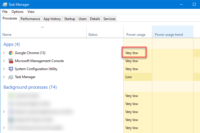 Als u Google Chrome of een andere browser gebruikt om YouTube te bekijken, kunt u een vermelding vinden in Taakbeheer. Vanaf hier kunt u de trend van het energieverbruik van die applicatie bekijken. Zelfs als u video's offline bekijkt, kunt u de naam van de mediaspeler vinden in Taakbeheer. Het enige wat u hoeft te doen is deStroomverbruikEnTrend stroomverbruikkolommen. Als ze zich laten zienZeer laag,Laag, ofGematigd, er is niets om je zorgen over te maken. Als ze gebruikenZeer hoog, je moet deze dingen doen-