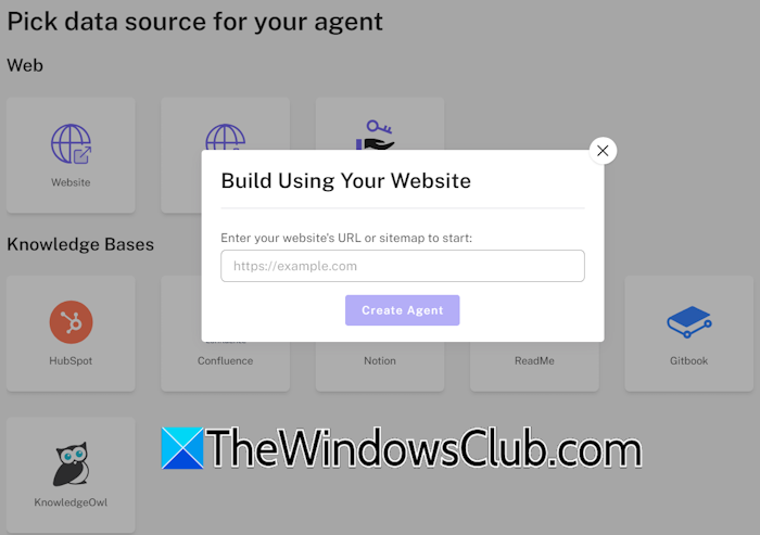 Er is een kennisbank vereist om een AI-agent te maken. U kunt op verschillende manieren een kennisbank aanbieden, zoals door de sitemap van uw website toe te voegen of een bestand te uploaden. U kunt ook een agent met API maken. Hierdoor wordt een agent gemaakt zonder dat er een gegevensbron is aangesloten.