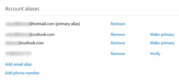 Meld u aan met uw Microsoft-account en u kunt uw e-mailaliassen voor Outlook, Live.com of Hotmail.com verwijderen of verwijderen.