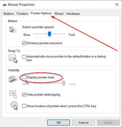 Pointer trails waren oorspronkelijk bedoeld voor LCD-monitoren met trage reactietijden. Bij moderne LCD-schermen is dit niet meer nodig. Deze functie blijft echter nuttig als u visuele problemen ondervindt.
