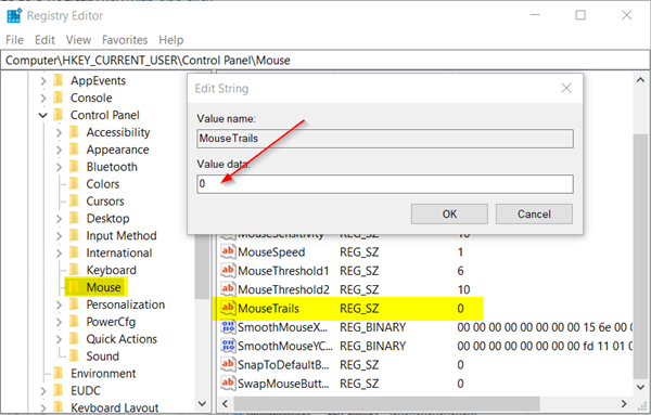 Dubbelklik op het item om de waardegegevens ervan te wijzigen in een getal tussen de onderstaande getallen voor de lengte van het muisaanwijzerspoor.