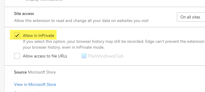 Het zou deDetailspagina van de extensie die u eerder hebt geselecteerd. Hier vindt u een optie genaamdToestaan in InPrivate.