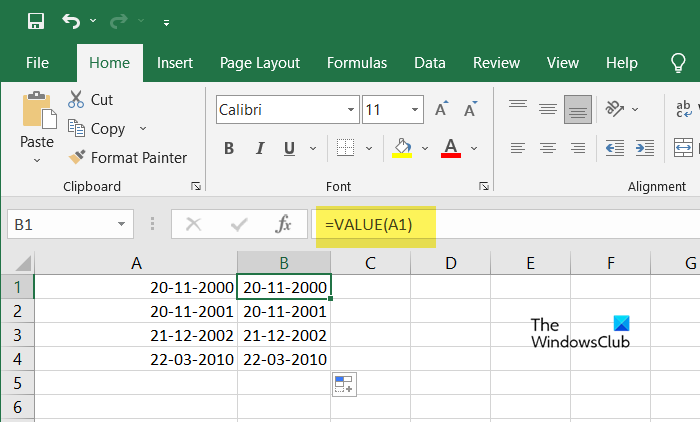 Als de functie Tekst naar kolommen niet werkt, kunt u overwegen deWAARDEfunctioneren als een uitstekende vervanger. Dit alternatief is met name voordelig in scenario's waarin datumwaarden met elkaar verweven zijn binnen uitgebreide tekstreeksen of waarin een uniforme opmaak ontbreekt, wat problemen met zich meebrengt voor het gereedschap Tekst naar kolommen om de datumwaarden nauwkeurig te verdelen.