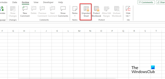 Ga naar deBeoordelingtabblad en klik op deBeveiliging blad opheffenknop in deBeschermengroep.