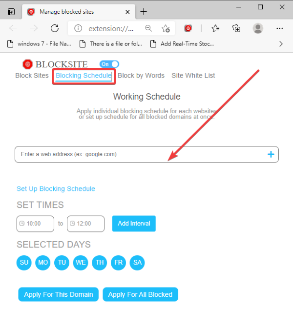 Nog een kenmerk van deze Edge-extensie dat het vermelden waard is, is deBlokkeerschemaoptie. U kunt een blokkeerschema voor een website toevoegen om deze voor een specifieke dag en duur te blokkeren.