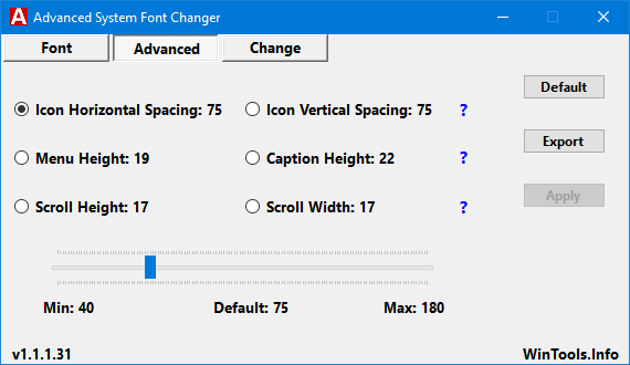 Met deze tool kunt u ook de lettergrootte wijzigen. Bovendien kunt u de pictogramafstand, menuhoogte, scrollhoogte, ondertitelhoogte, scrollbreedte, enz. aanpassen. Om deze tool te kunnen gebruiken, moet u de draagbare tool downloaden en openen.