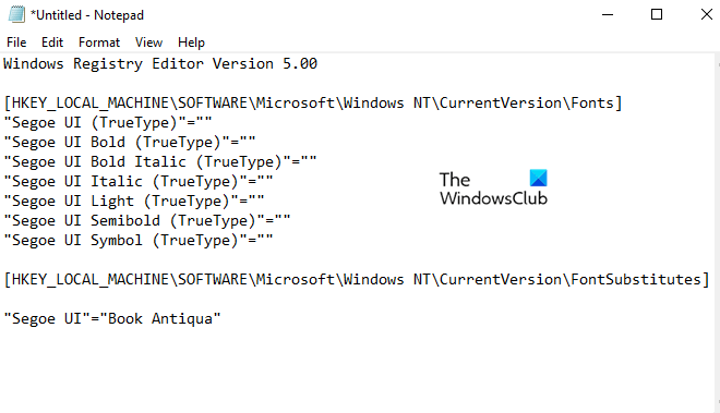 Windows Registry Editor Version 5.00 [HKEY_LOCAL_MACHINE\SOFTWARE\Microsoft\Windows NT\CurrentVersion\Fonts] "Segoe UI (TrueType)"="" "Segoe UI Bold (TrueType)"="" "Segoe UI Bold Italic (TrueType)"="" "Segoe UI Italic (TrueType)"="" "Segoe UI Light (TrueType)"="" "Segoe UI Semibold (TrueType)"="" "Segoe UI Symbol (TrueType)"="" [HKEY_LOCAL_MACHINE\SOFTWARE\Microsoft\Windows NT\CurrentVersion\FontSubstitutes] "Segoe UI"="NEW_FONT"