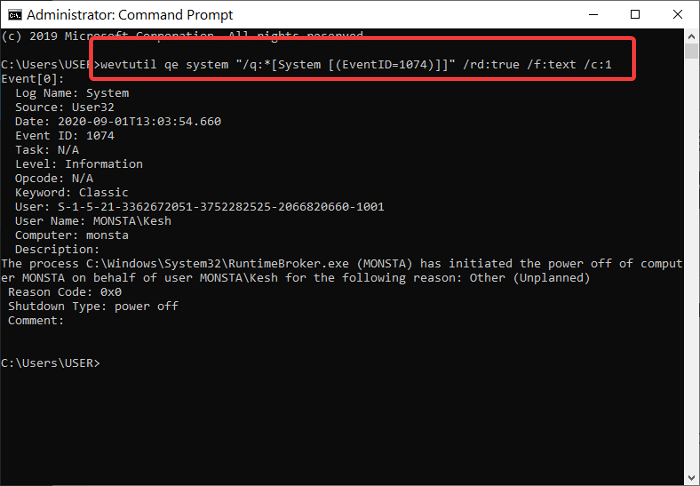 wevtutil qe system "/q:*[System [(EventID=1074)]]" /rd:true /f:text /c:1