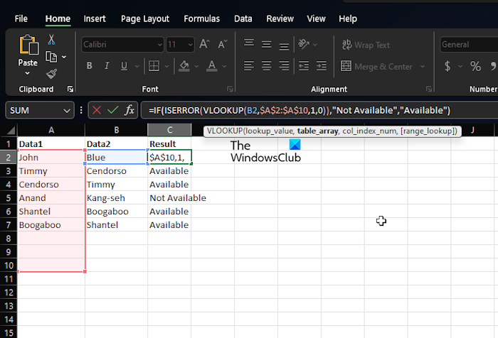 De bovenstaande formule controleert de naam in kolom B met alle namen in kolom A. Als er een exacte overeenkomst wordt gevonden, zorgt de formule ervoor dat de naam wordt geretourneerd, en als dat niet het geval is, wordt in plaats daarvan #N/A weergegeven. Daarom hebben we ervoor gekozen om de functies IF en ISERROR op te nemen, verpakt in VLOOKUP.
