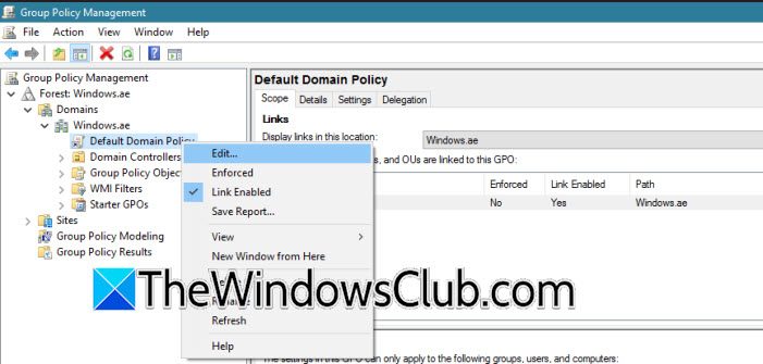 - Nu moet je naar toeForest: Windows.ae > Domeinen > Windows.ae > klik met de rechtermuisknop op Standaarddomeinbeleid,en selecteer Bewerken.