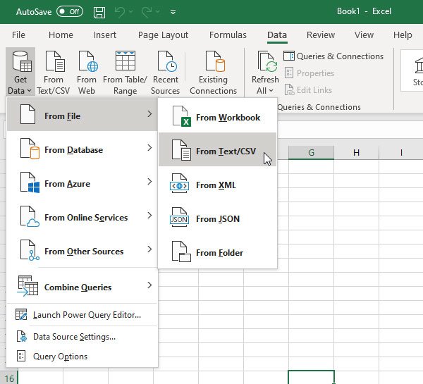 - U kunt een optie vinden genaamdVan tekst/CSVhier. Als u deze optie niet kunt vinden, ga dan naarGegevens ophalen>Uit bestand>Van tekst/CSV.