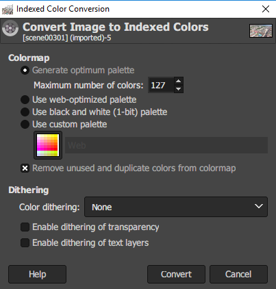 Kies Geïndexeerd in plaats van RGB en stel het Maximaal aantal kleuren in op 127.
